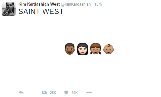 The reality star wrote simply: ‘Saint West, 12.05.15, 8 pounds 1 ounce.’