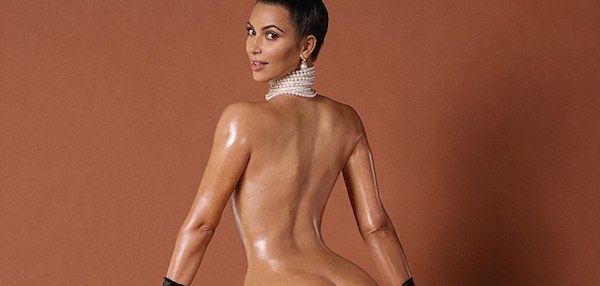 Kim recreates French photographer Jean-Paul Goude‘s famous ‘Champagne Incident’ shot on the cover of the magazine and also poses naked with her broad backside oiled up and exposed, as part of its ‘Break the Internet’ campaign.