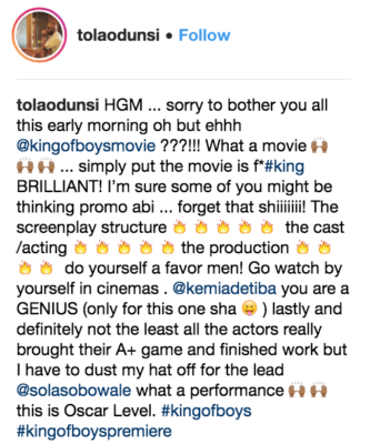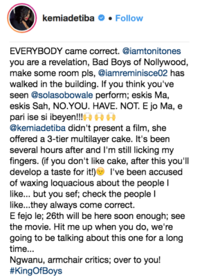 ‘King of Boys’ which will be in cinemas on the 26th, features and an all-star cast with some of Nollywood’s finest including Sola Sobowale, Jide Kosoko, Paul Sambo, Adesua Etomi, Toni Tones, Sharon Ooja, Ademola Adedoyin, Lanre Hasan (Iya Awero), Osas Ighodaro, Funlola Aofiyebi, Sani Mu’azu, Paul Sambo as well as break out performances from hip-hop gods Reminisce and ill Bliss.