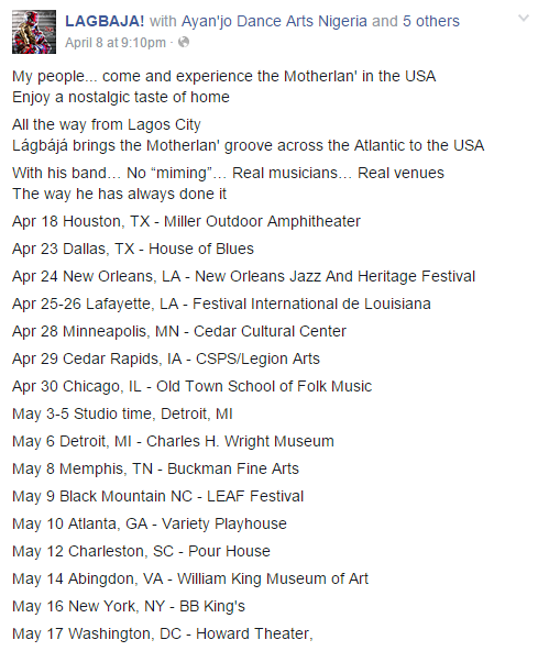 The tour will see Lagbaja and his Motherland band perform at 15 different cities over a period of 1 month. The tour will commence on April 18, 2015 with a performance in Houston and end on May 17, 2015 at Washington DC.