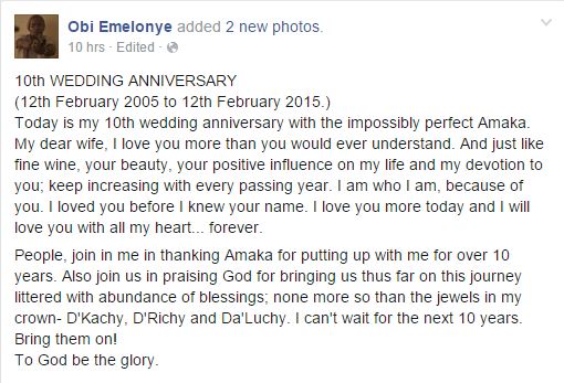 As a way of putting the many blessings of the union in context, he added a romantic message as caption: ’10th WEDDING ANNIVERSARY (12th February 2005 to 12th February 2015.) Today is my 10th wedding anniversary with the impossibly perfect Amaka. My dear wife, I love you more than you would ever understand. And just like fine wine, your beauty, your positive influence on my life and my devotion to you; keep increasing with every passing year. I am who I am, because of you. I loved you before I knew your name. I love you more today and I will love you with all my heart… forever…’