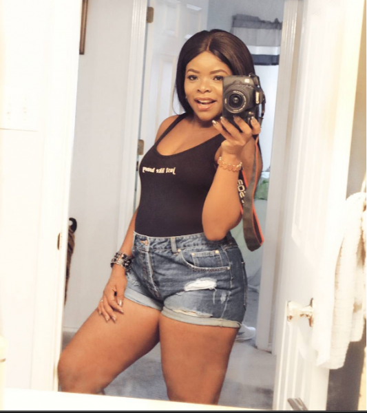She also used the opportunity to show off her post-baby body in a tank top and denim bum shorts writing, ‘No body magic, no spanx nothing. I’m working on my diet first before the waist training.