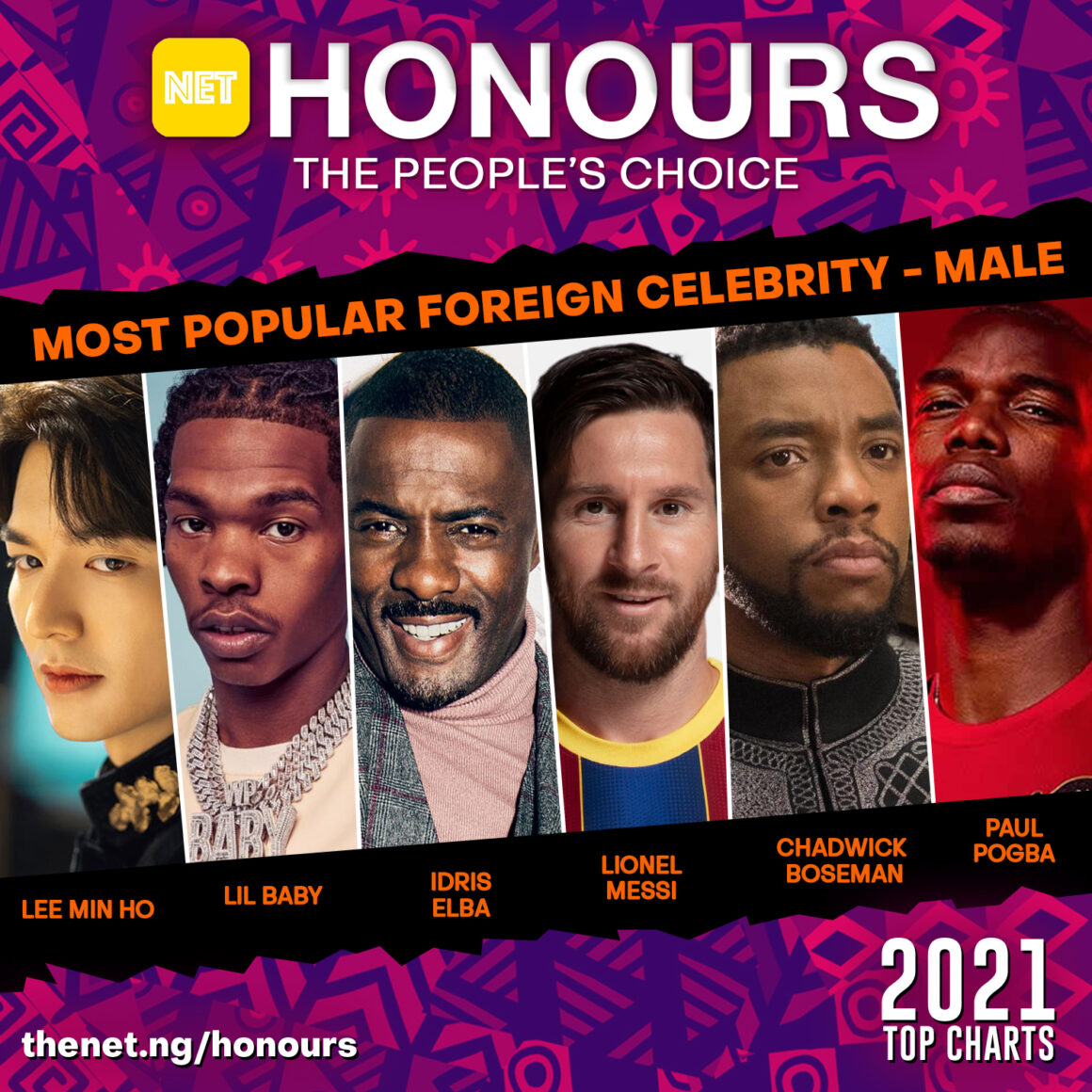 Lee Min-Ho, Chadwick Boseman, Lil Baby, Idris Elba, Paul Pogba and Lionel Messi go head-to-head in the category of Most Popular Foreign Male Celebrity at the NET Honours People’s Choice Awards, one of the world’s most prestigious audience data-based awards.
