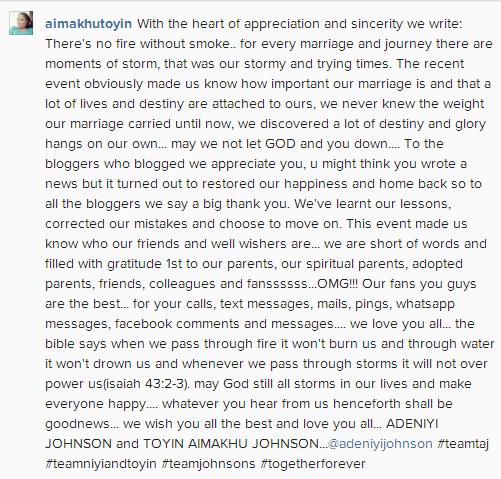 In a lengthy post uploaded on Instagram by Toyin, which was immediately re-posted by her hubby, Adeniyi; the couple admitted to have recently had issues in their marriage but the widespread of the news resulted in events that immediately brought them back together and even stronger.