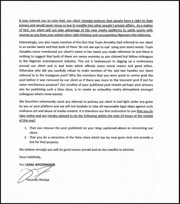 The blogger has been directed to remove a post published about the Nollywood actress and filmmaker by Legal Aficionados, Funke’s lawyers who also demand a retraction of the alleged false story within 24hrs of receiving their mail.
