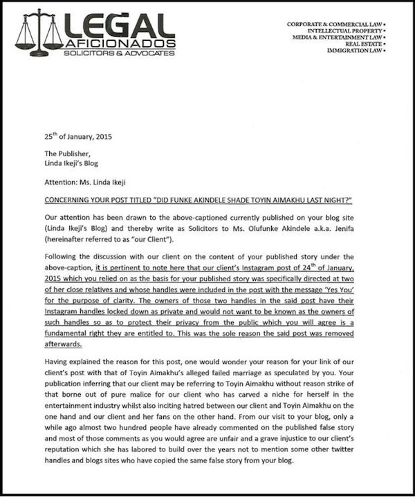 Popular blogger, Linda Ikeji faces the risk of litigation as she is yet to comply with the directive issued yesterday, January 25, 2015 by Funke Akindele‘s legal representatives.