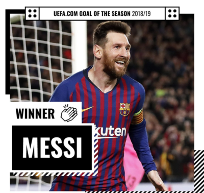 Lionel Messi’s free-kick goal against Liverpool has been voted as the UEFA Champions League Goal Of The Season.