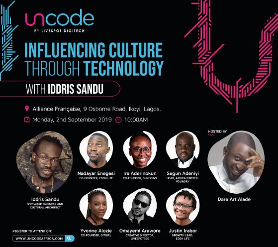 Tech Virtuoso Iddris Sandu; Co-founder of BuyCoins, Ire Aderinokun; Head at Africa Fintech Foundry, Segun Adeniyi; Co-founder of Andela and Eden Life, Nadayar Enegesi; and Yvonne Alozie, Director of Programs at Gitgirl, are some of the speakers and panellists set to headline the maiden edition of Livespot360’s tech-focused and creative conference, UNCODE, on September 2, 2019 at the Alliance Française, Ikoyi, Lagos.