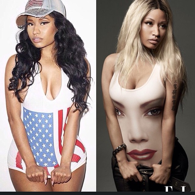 Voluptuous rapper, Nicki Minaj, on Wednesday, January 7, 2015, posted a picture comparing herself with her hair dark in a part and blonde in the other, writing: ‘Thinking about going back blonde.’