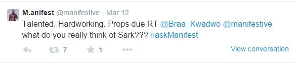 The ‘No Shortcut to Heaven’ rapper who opened a question and answer session dubbed #AskManifest on Twitter on Thursday, March 12, 2015, saw of one his fans asking: ‘What do you think of Sark?’ M.anifest, who has been a rival of Sarkodie in the past, tweeted: ‘Talented. Hardworking. Props due’