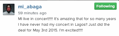 The rapper, who released his 3rd studio album, The Chairman in October 2015, made the announcement via Instagram where he wrote: ‘MI live in concert. It’s amazing that for so many years I have never had my concert in Lagos!! Just did the deal for May 3, 2015. I’m excited.’