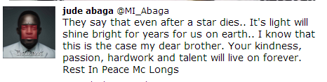 Mourning the late entertainer, rapper M.I took to Twitter today to write: ‘They say that even after a star dies. Its light will shine bright for years for us on earth. I know that this is the case my dear brother. Your kindness, passion, hard work and talent will live on forever. Rest In Peace MC Longs.’
