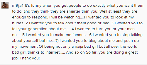 In her words: ‘It’s funny when you get people to do exactly what you want them to do, and they think they are smarter than you! Well at least they are enough to respond, I will be watching.1 I wanted you to look at my nudes. 2 I wanted you to talk about them good or bad. 3 I wanted you to tell your generation about me. 4 I wanted to turn you or your man on. 5 I wanted you to make me famous. 6 I wanted you to stop talking about yourself but me. 7 I wanted you to blog about me and push up my movement of being not only a naija bad girl but all over the world bad girl, thanks to internet. And so on So far, you are doing a great job! Thank you.’