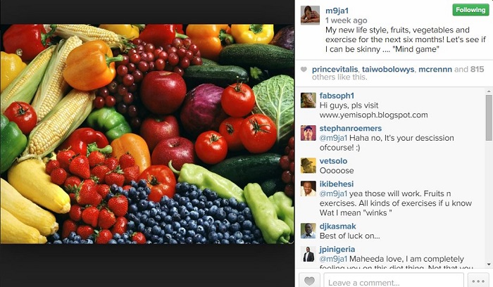 She took to her Instagram account recently to post a picture of several fruits which will be feeding on for the next 6 months alongside a strict exercise regime.
