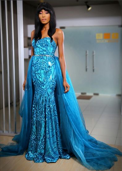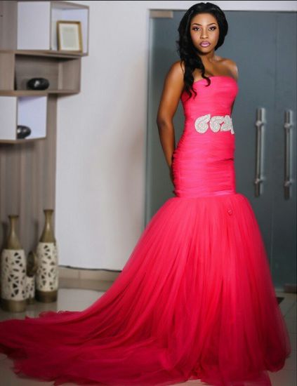 This tube dress with silver embellishment looks absolutely gorgeous. We understand the tulle used to make the fish design and train is about a hundred yards.