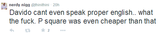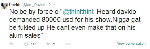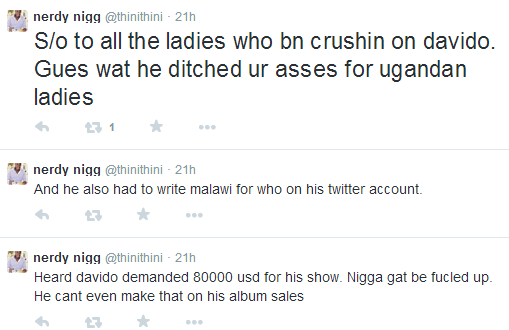 Nerdy Nigg, who tweets through the handle: @thinithini wrote: ‘S/o to all the ladies who been crushing on davido. Guess what he ditched your asses for Ugandan ladies, Heard Davido demanded 80000 usd for his show. Nigga gat be fucked up. He can’t even make that on his album sales.’