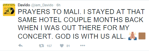 HKN star, Davido who was robbed barely 7 days ago at gun-point in South Africa also tweeted that he performed in Mali a few months back and stayed at the same hotel where the terror attack took.
