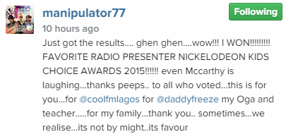 Mannie joins last year’s winner, Freeze as the second Nigerian OAP to be so recognized at the Kids Choice Awards since inception in April 1988.