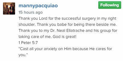 5 days after the bout, Manny Pacquiao has had a successful surgery on the arm and he’s just shared post-surgery photos on Instagram through which he thumbs his medical team led by Dr. Neal Ellatrache.