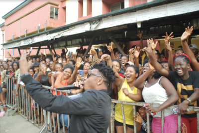 On Wednesday evening, students poured in from around the Campus to the Malabor Girls hostel in UNICAL to be thrilled and the Pulse Invasion did not miss a beat. The DJ kept the students jumping on their feet. Comedy took its turn when the MC switched to his funny side and had the students in stitches. Soon whispers swept through the audience – some people had spotted someone that resembled DMW signee Mayorkun. Screams of excitement later confirmed the whispers – the Tear Rubber singer, had landed on the campus and was headed for the field near the Malabor Hostel!