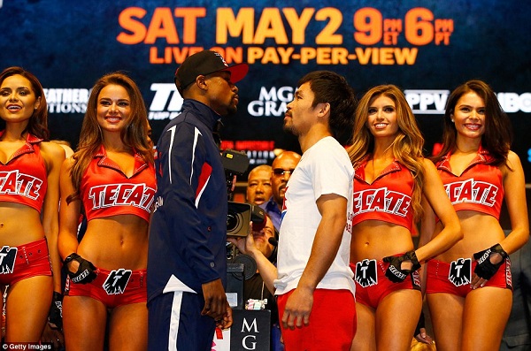 The face off and weight checking which took place at the MGM Grand Garden Arena with a huge crowd present at the venue, World Boxing Association and World Boxing Council champion Mayweather weighed in at 146 pounds (66.22 kg), one pound under the welterweight limit, which is actually 147lb, while World Boxing Organization champion Pacquiao weighed in at 145 pounds.