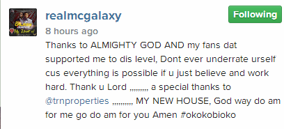 MC Galaxy today, February 19, 2015 announced to his fans via instagram that he has just acquired a brand new house in Lekki, Lagos from ‘TRN properties’. He shared photos of the house with the caption: ‘Thanks to ALMIGHTY GOD AND my fans dat supported me to dis level, Dont ever underrate urself cus everything is possible if u just believe and work hard. Thank u Lord …. a special thanks to @trnproperties. MY NEW HOUSE, God way do am for me go do am for you Amen #okokobioko’.