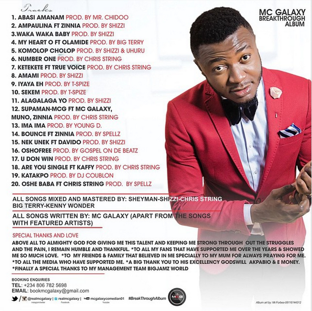 Fast rising Nigerian comedian and singer, Innocent Udeme Udofot otherwise called MC Galaxy has unveiled the album art and track list for his debut album, Breakthrough.