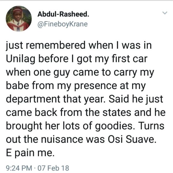 Popular Beat FM OAP Osi Suave had a weird throwback encounter today after one of his followers threw it back to 6 years ago when a guy snatched his babe and it turns out the girlfriend snatcher is Osi Suave.