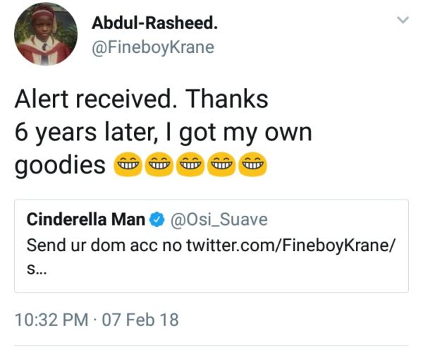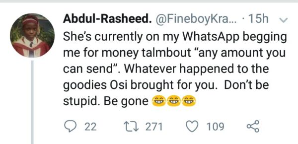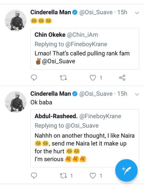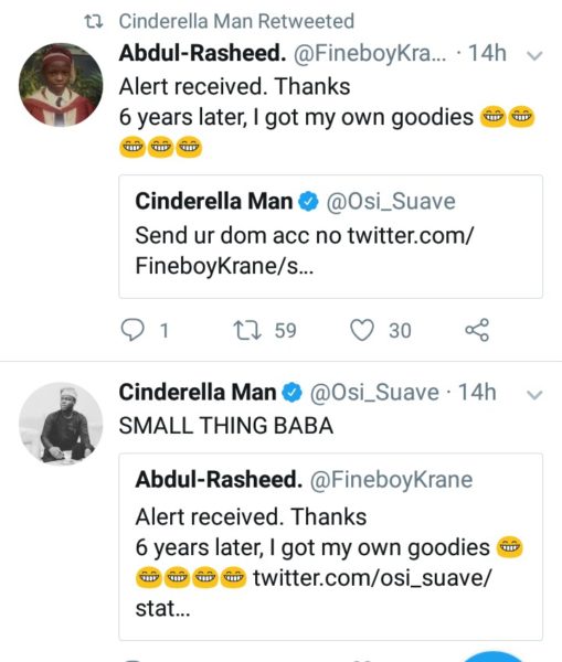 The follower however asked for a money instead, Osi asked for his account number and surprisingly, he sent an undisclosed amount of money to the guy as a compensation for his troubles.