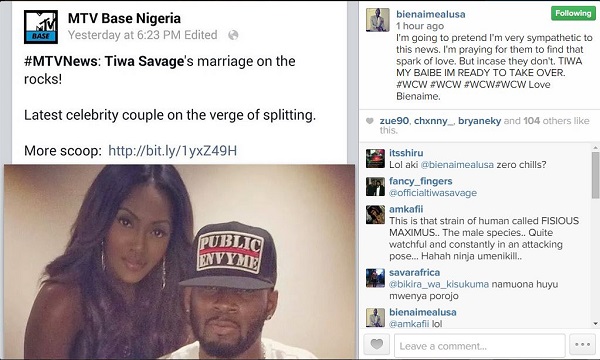 Although news making rounds have it that Tiwa Savage and Tee Billz heading for a divorce with issues regarding their marriage and Bien, who is a vocalist for Kenyan afro-pop band, Sauti Sol has taken to his Instagram page to announce his availability for Tiwa Savage.