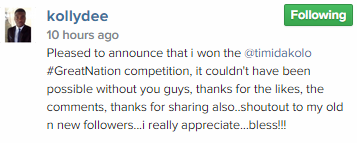 According to the singer, all the fans had to do was sing, record and upload a rendition of the ‘Great Nation’ chorus, a special Independence song by Timi Dakolo, with the video with highest votes on his timeline set to win the cash prize on offer.
