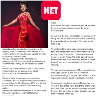 She said, “We admit that a dispatch error occurred on the delivery of the dress to Miss Lawrentta who was set to get married on the 30th December and the pick up of another dress on behalf of the actress, Mercy Aigbe”.