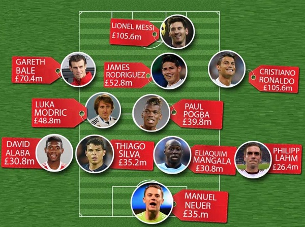 According to Metro Sport reports, the list includes 4 players from Real Madrid (Cristiano Ronaldo (£105.6m), Gareth Bale (£70.4m), James Rodriguez (£52.8m) and Luka Modric (£48.8m) while three players are from Bayern Munich (David Alaba (£30.8m), Philipp Lahm (£26.4), Manuel Neuer (£35.m) and each from Barcelona – Lionel Messi (£105.6m), Manchester City (Eliaquim Mangala at £30.8m), Juventus (Paul Pogba at £39.8m) and PSG (Thiago Silva for £35.8m.)