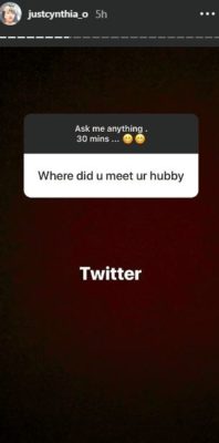 Cynthia was asked on her Instagram story about how she met her husband and she simply answered ‘Twitter’, using the newly introduced Q&A feature on the popular social media platform.