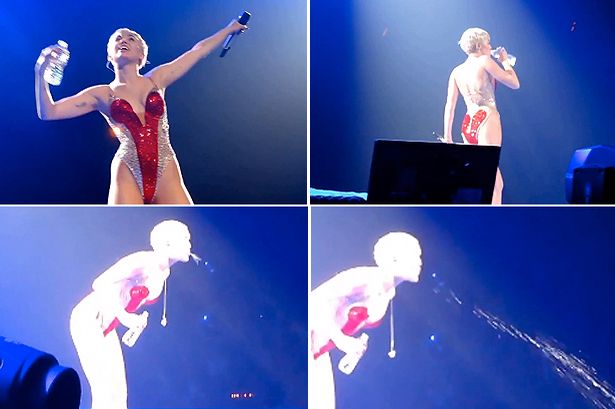 The singer drank from a bottle of water while talking to the crowd, and then spat it all over fans near the front of the stage.