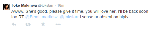 But when one fan made it known to her that she is missed on the show today, Toke had words of patience, thumbing up her replacement. She however hinted that she’ll be returning to Hip TV soon but didn’t say in what capacity since the show already has a new host.