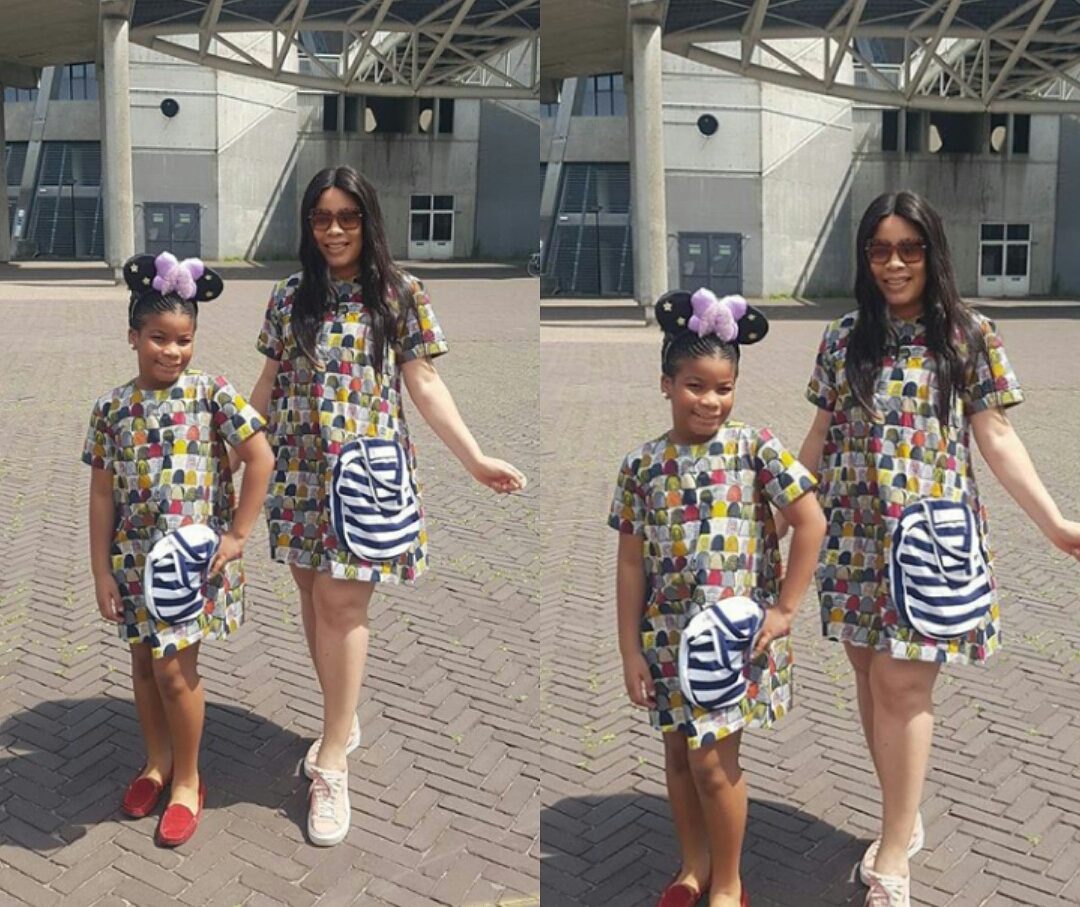 Nollywood actress, Monalisa Chinda Coker, was twinning with her daughter, Tamara, as both stepped out in matching short gowns and bag.