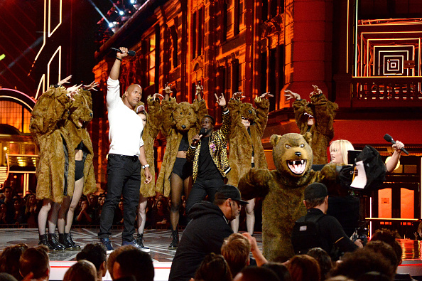 This year’s MTV Movie Awards co-hosts Dwayne Johnson and Kevin Hart mocked the bear scene in ‘The Revenant’ during the awards ceremony.