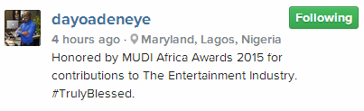 Adeneye received the special award from popular fashion designer, Clement Enajemo popularly known as MUDI Africa who presented the award to him at his Lagos office. Sharing the award on social media, Dayo Adeneye wrote: ‘Honored by MUDI Africa Awards 2015 for contributions to The Entertainment Industry.#TrulyBlessed.’