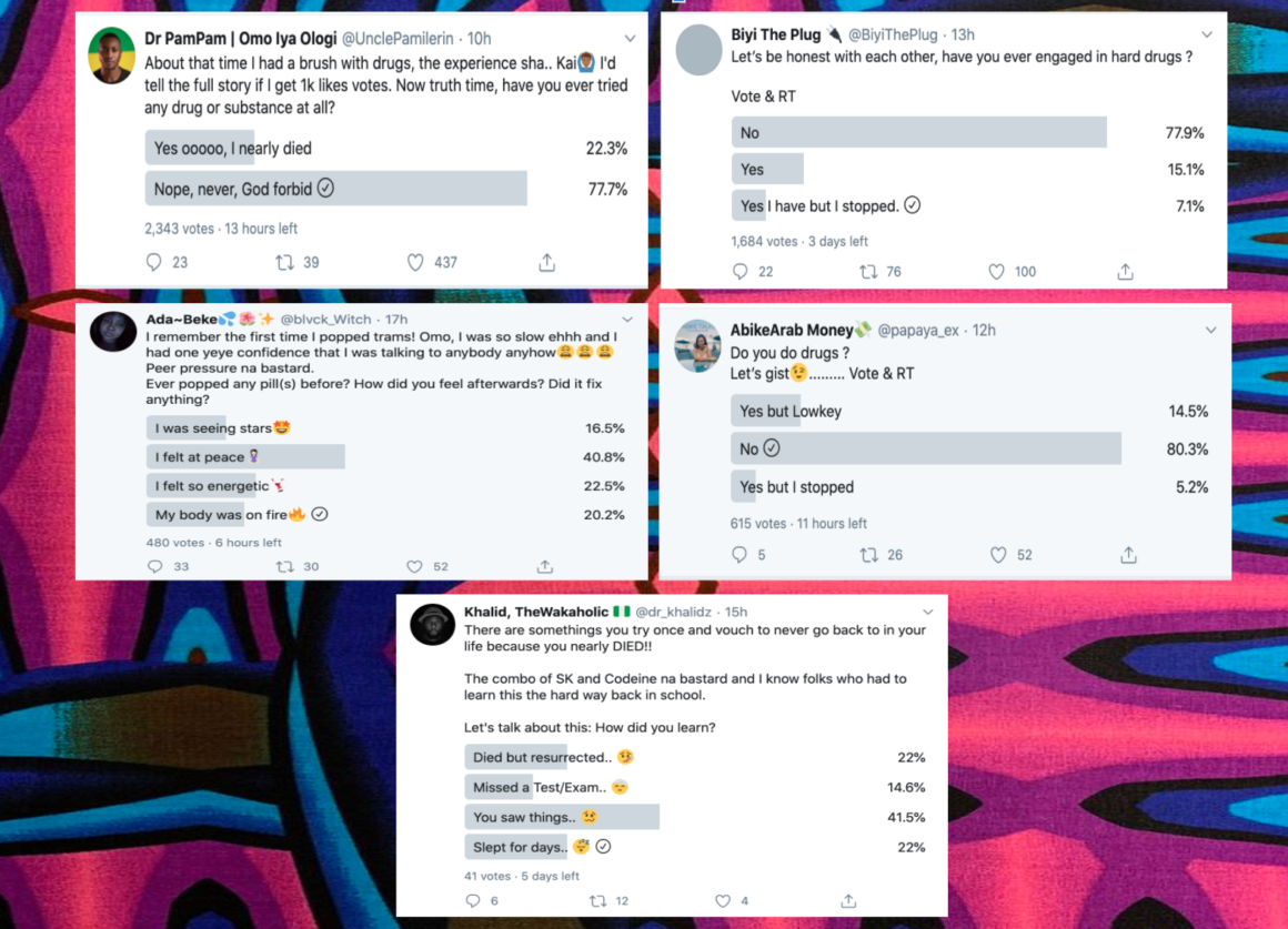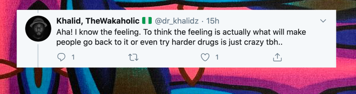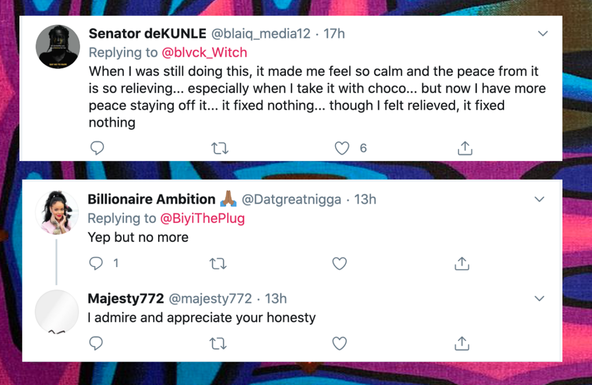 On Naija Twitter, one of the big topics over the weekend was substance abuse and addiction. Some popular social media users like @UnclePamilerin and @BiyiThePlug asked a few simple questions like ‘have you smoked weed?’ ‘have you tried Trams? and the floodgates opened.