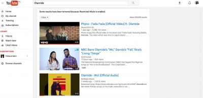 Guess whose video doesn’t come up when you activate the Restriction Mode on YouTube? You’re right: Baddo Sneh – Olamide. A large chunk of his material is invisible when the Restricted Mode is on. Nobody has accused YouTube of overstepping its boundaries with this measure. It is to protect minors and those whose sensibilities are easily offended.