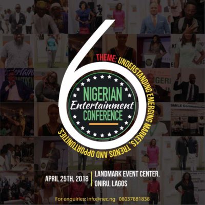 On Wednesday, April 25, 2018, the sixth annual Nigerian Entertainment Conference will take place in Lagos to discuss issues pertaining to the entertainment industry in Nigeria.