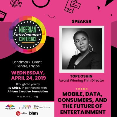 Nigerian film/television producer and director Tope Oshin this year will speak at the 2019 edition of Nigerian Entertainment Conference. It is the first time the motion picture professional will speak at the event.