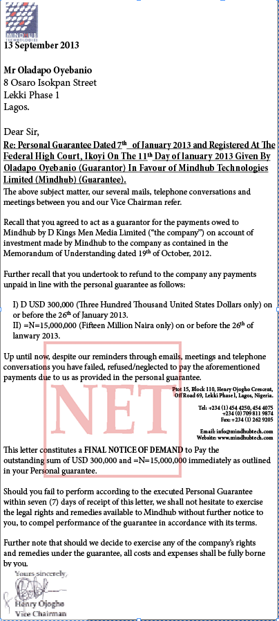 ‘This letter constitutes a FINAL NOTICE OF DEMAND to Pay the outstanding sum of USD 300,000 (Three hundred thousand Dollars) and N15m (Fifteen million Naira) immediately as outlined in your personal guarantee.