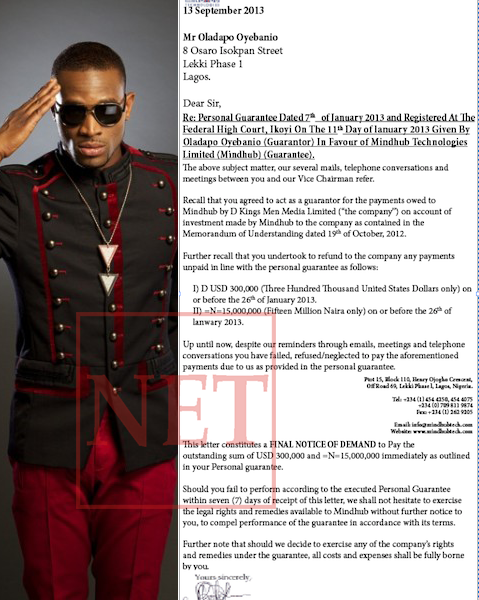 In the letter, dated September 13, 2013, Henry gave D’banj a final warning to refund the money owed him or be prepared to face full wrath of the law.
