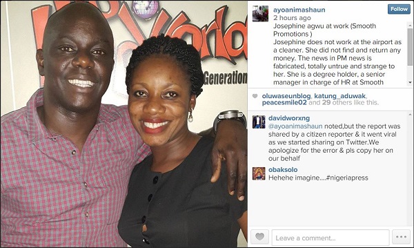 CEO of Smooth Promotions and Hip Hop World Magazine, Ayo Animashaun, has rubbished reports about a top member of staff of the media establishment, Josephine Agwu, who was erroneously reported to have returned some money while working as a cleaner at the Murtala Muhammed International Airport days ago.