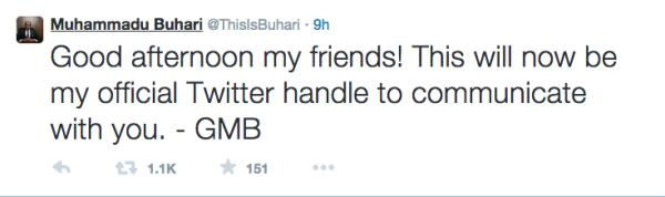 All Progressive Congress presidential candidate, Muhammadu Buhari today joined micro blogging social network, Twitter.