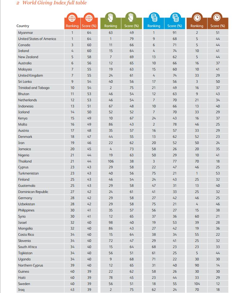 In the survey, Nigerians were scored a World Giving Index of 49% coming behind Kenyans who were ranked number one in Africa and 15th in the world. On the overall list, Myanmar ranks No 1 followed by United States of America, Canada, Ireland, New Zealand, Austrialia in that order.