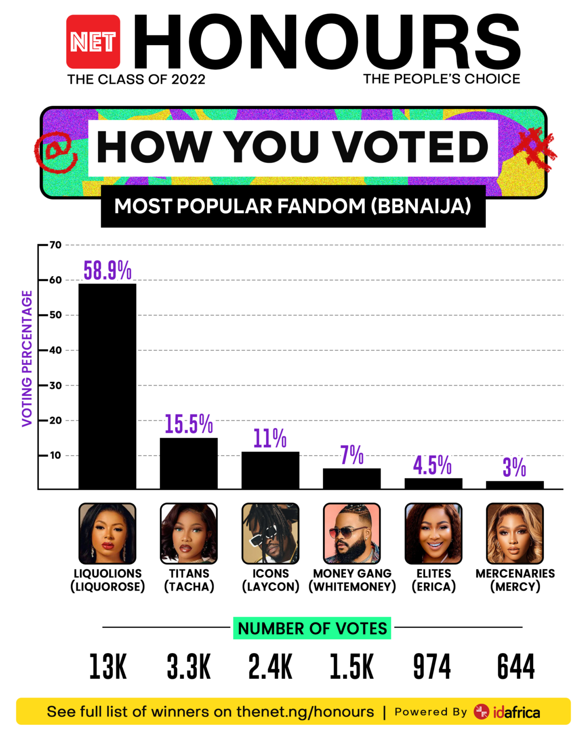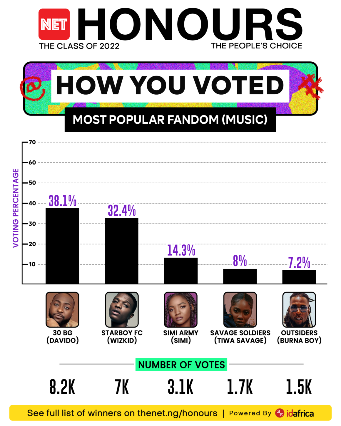 In a stiff voting contest between Davido’s 30 BG fanbase and WizKid FC, 30 BG edged their rivals with 38.1% of total votes to emerge Most Popular Music Fandom, while Starboy FC pulled 32.8% of votes. Liquolions, the fandom of BBNaija 2021 runner-up, Liquorose, emerged Most Popular BBNaija Fandom, beating Whitemoney’s Money Gang, and Titans, the fanbase of Tacha.