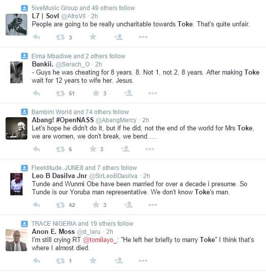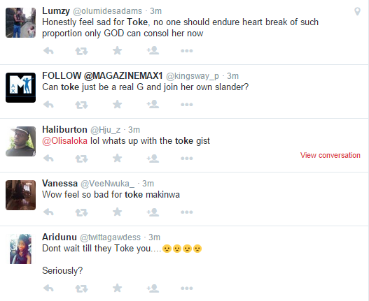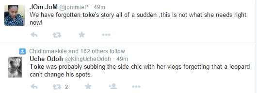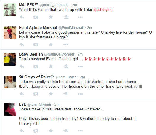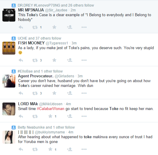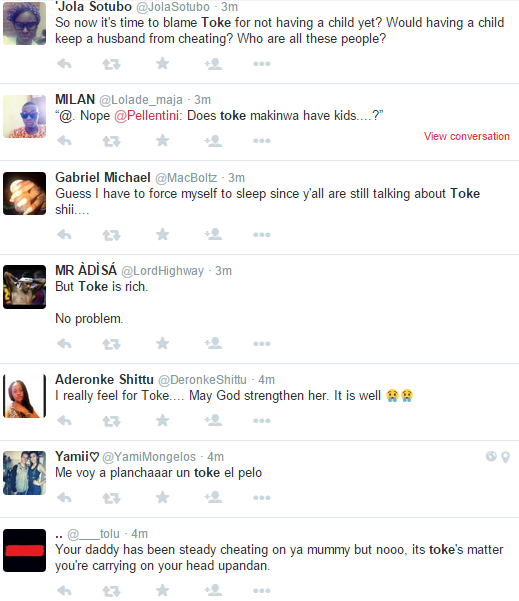 The comments and reactions keep pouring in torrents making her the top trending topic across social media. Below are the top comments on Toke’s marriage crisis..